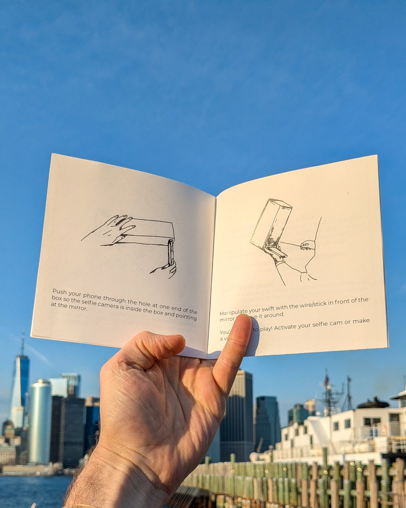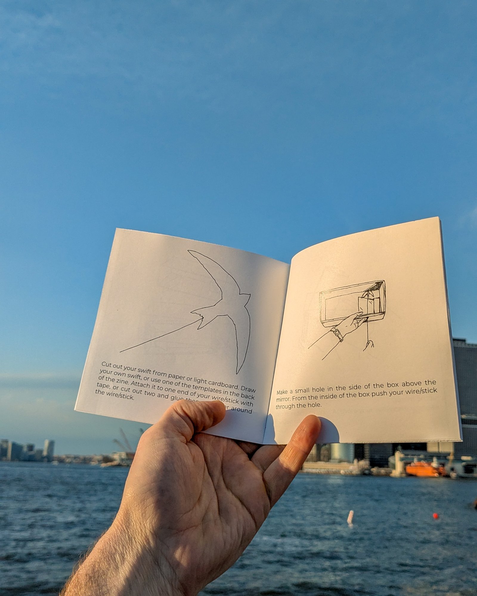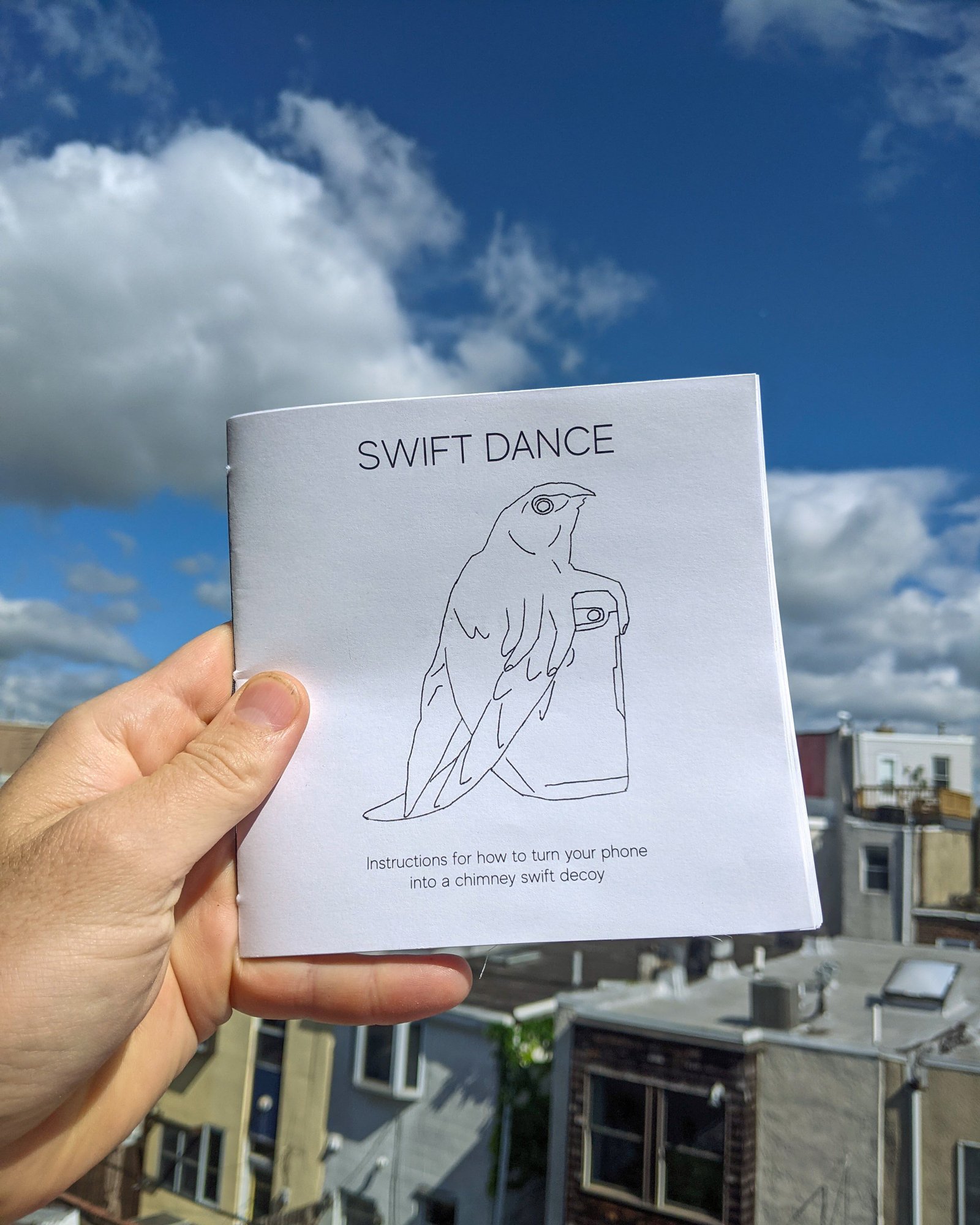 SSwift Dance is a ridiculous analog interruption of a technology created to make the worker ever available, regardless of their location, for meetings. You are unavailable. A chimney swift has taken your place. An instruction manual and series of workshops, Swift Dance, guides players in making a decoy that turns them into a bird. Get the zine here